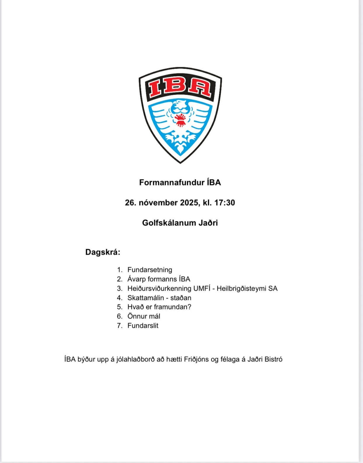 Minnum formenn og framkvæmdastjóra aðildarfélaga ÍBA á formannafund ÍBA sem fram fer í Golfskálanum að Jaðri í dag klukkan 17:30.