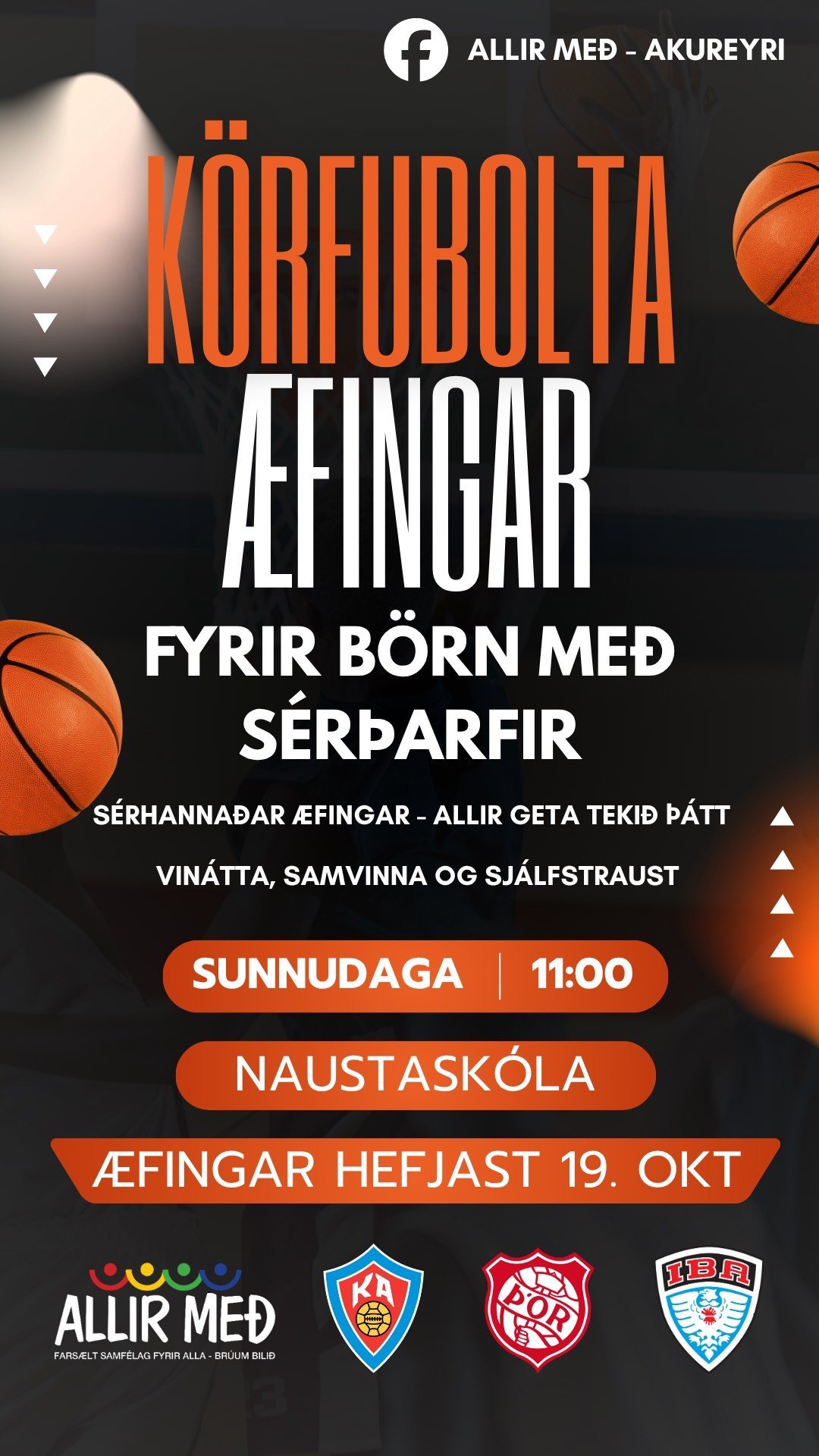 Líkt og síðasta vetur standa íþróttafélögin Þór og KA fyrir sameiginlegum íþróttaæfingum í Naustaskóla fyrir börn með sérþarfir. Í sumar voru sérhannaðar fótboltaæfingar í Boganum en nú er boðið upp á körfuboltaæfingar. Æfingarnar eru hugsaðar fyrir börn sem þurfa sem dæmi meiri stuðning, hentar betur að vera í minni hópum og hafa aðgengi að fleiri þjálfurum á æfingum. Allir ættu að geta tekið þátt og eru allir velkomnir.